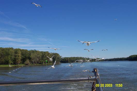 Peoria. These birds the locals called pelicans followed us for miles;